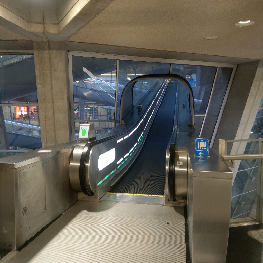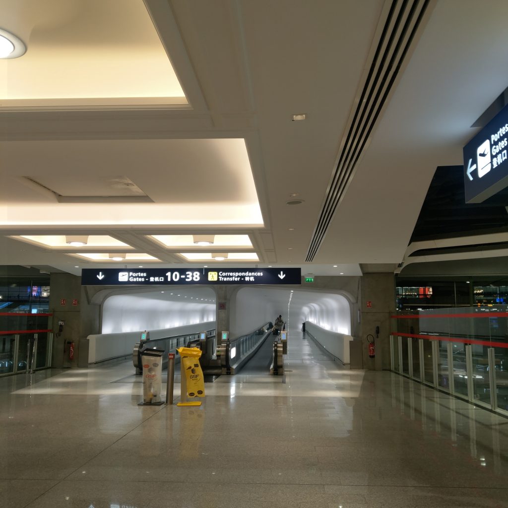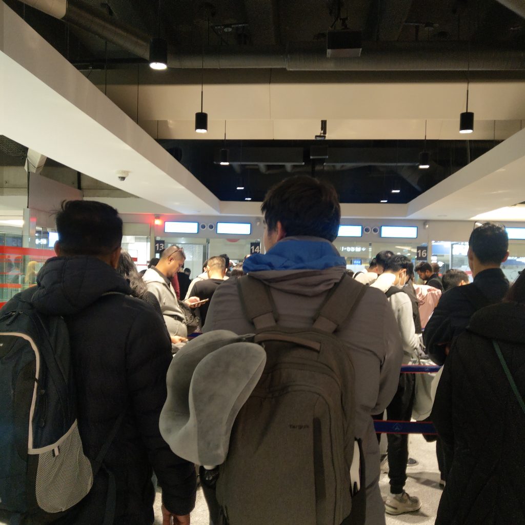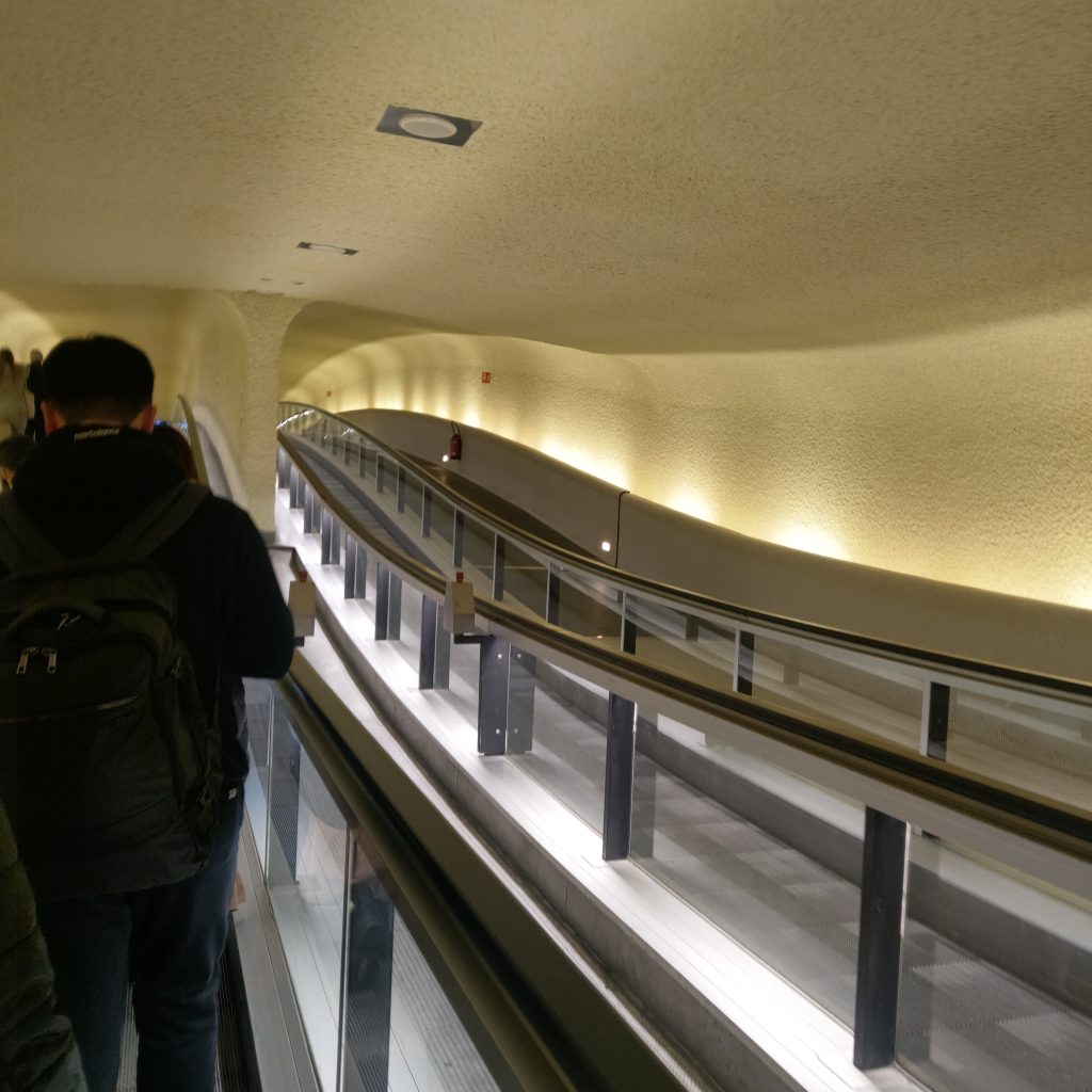 往入境方向走會經過不少很夢幻的長型隧道,柔和的黃光潤飾下,充滿電影既視感,不知道隧道的盡頭會通向何方? 進入機場後有穿紅背心的志工指引方向,大多英語流暢,很快地可以引導旅客到入境的廊道,只是一大早入境人員雖然不算多,但是前方的紅龍動線依舊維持人多時的排列方式,旅客得要像繞迷宮一樣蜿蜒前進(明明可以調整紅龍走直線),才有辦法接到遙遠前方的隊伍。
