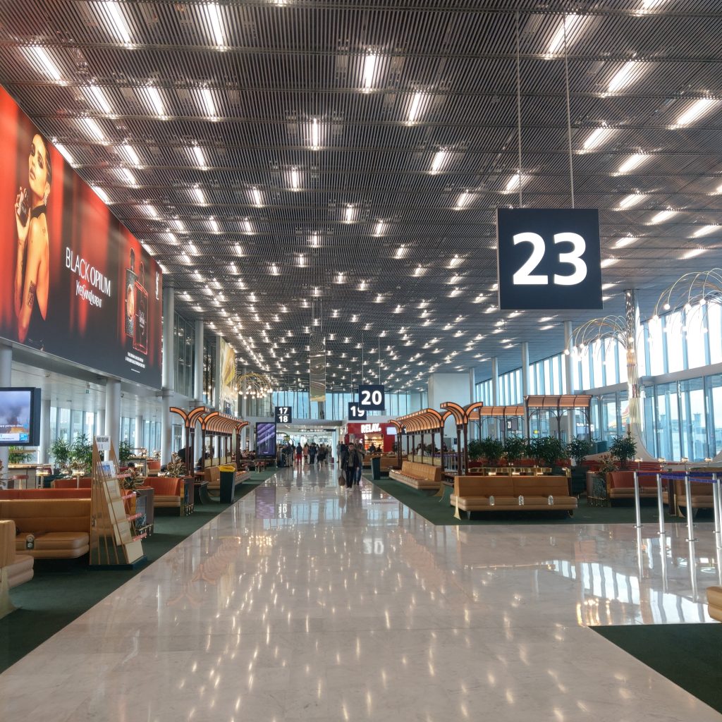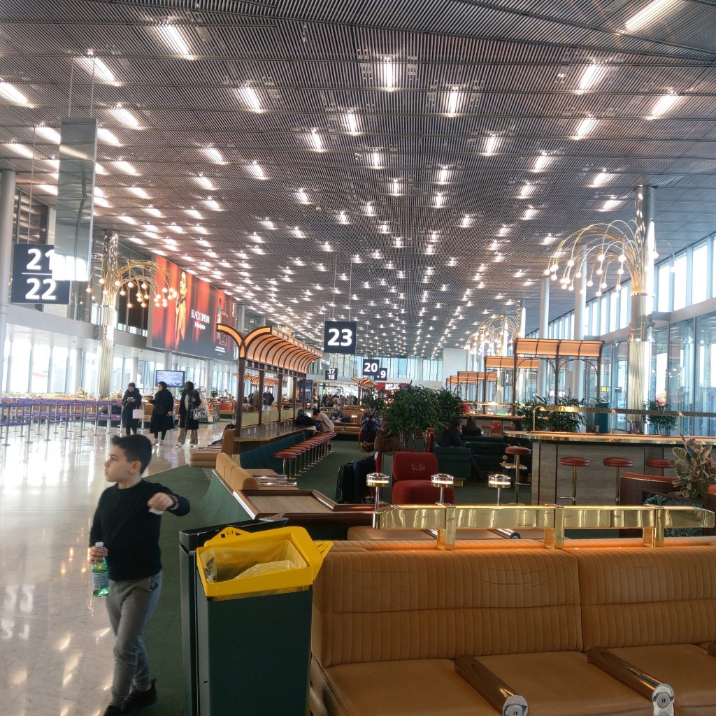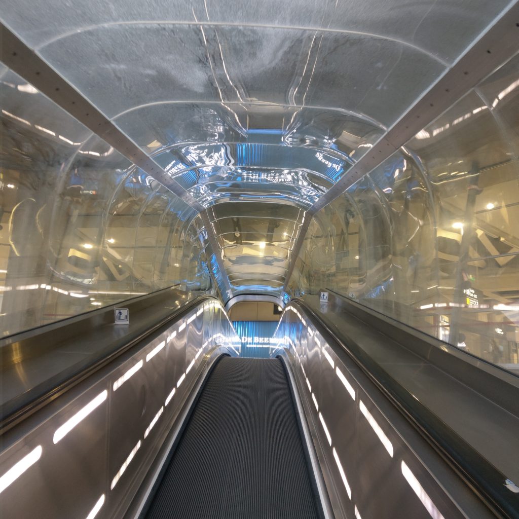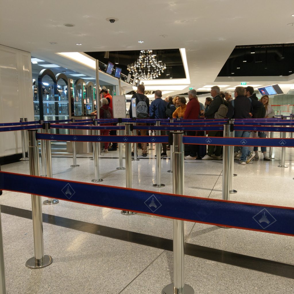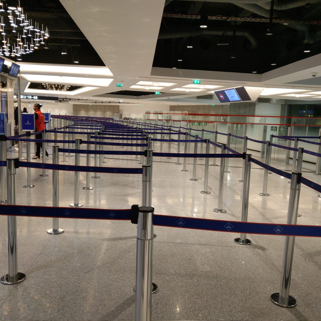 往入境方向走會經過不少很夢幻的長型隧道,柔和的黃光潤飾下,充滿電影既視感,不知道隧道的盡頭會通向何方? 進入機場後有穿紅背心的志工指引方向,大多英語流暢,很快地可以引導旅客到入境的廊道,只是一大早入境人員雖然不算多,但是前方的紅龍動線依舊維持人多時的排列方式,旅客得要像繞迷宮一樣蜿蜒前進(明明可以調整紅龍走直線),才有辦法接到遙遠前方的隊伍。