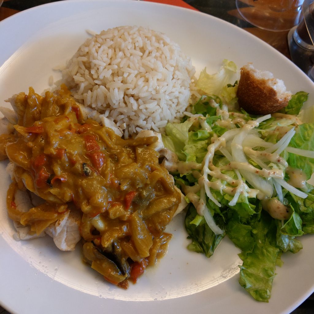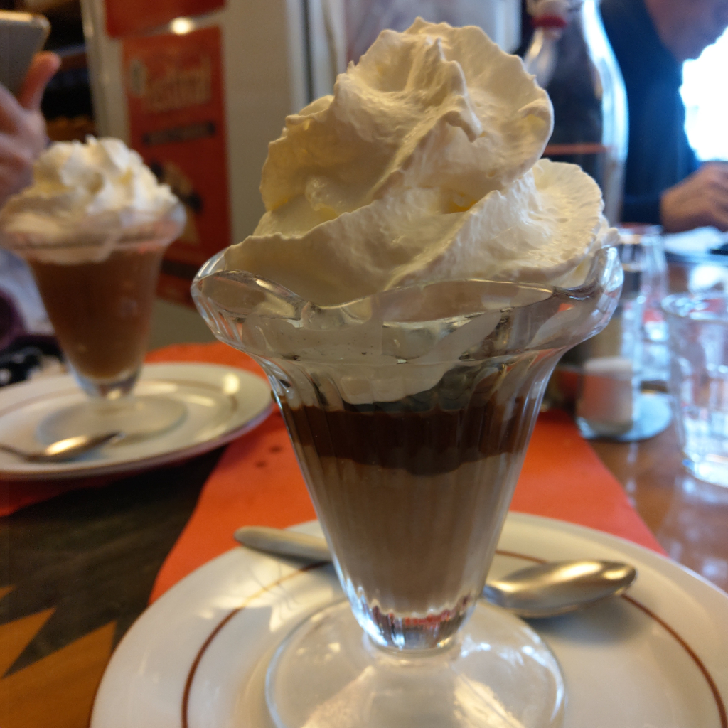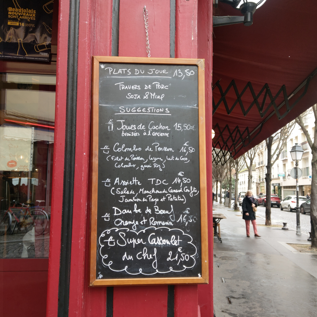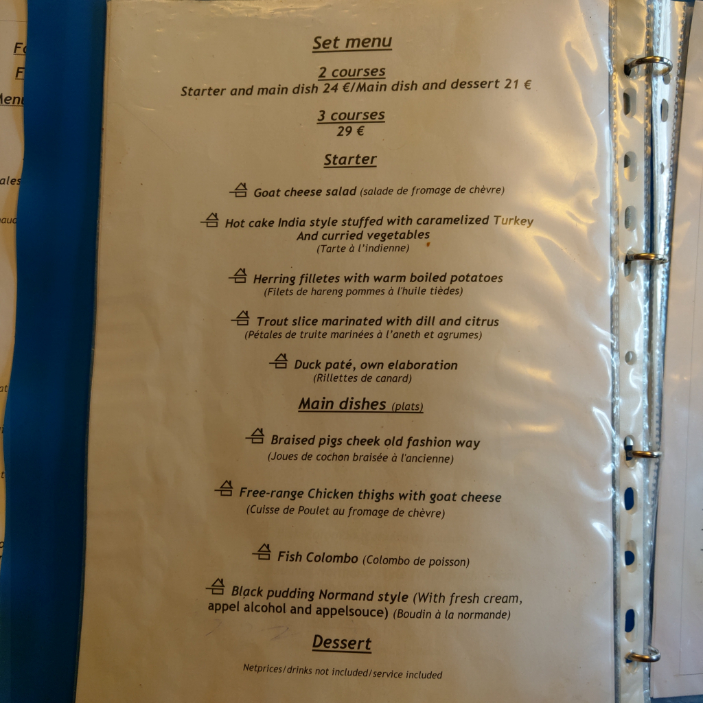 入住時間是下午3點,櫃台表示可以利用飯店休息區整理行李,暫寄於儲藏室。因為長途航班的勞累加上時差,整理行李的時候感覺自己思考的速度變得非常緩慢,行李翻來找去半天才能找到想要的東西,整頓好行李後,已經是中午12點多了,附近餐酒館林立,一時不知道要從何選起,挑了一家順眼的餐館入內,店員英文可通且有英文菜單,最便宜的主餐加甜點要21歐,選了一道Colombo de Poisson(Fish Colombo)以及巧克力聖代,友人則選擇24歐的套餐,選擇山羊起司沙拉、燉豬頰以及栗子聖代。