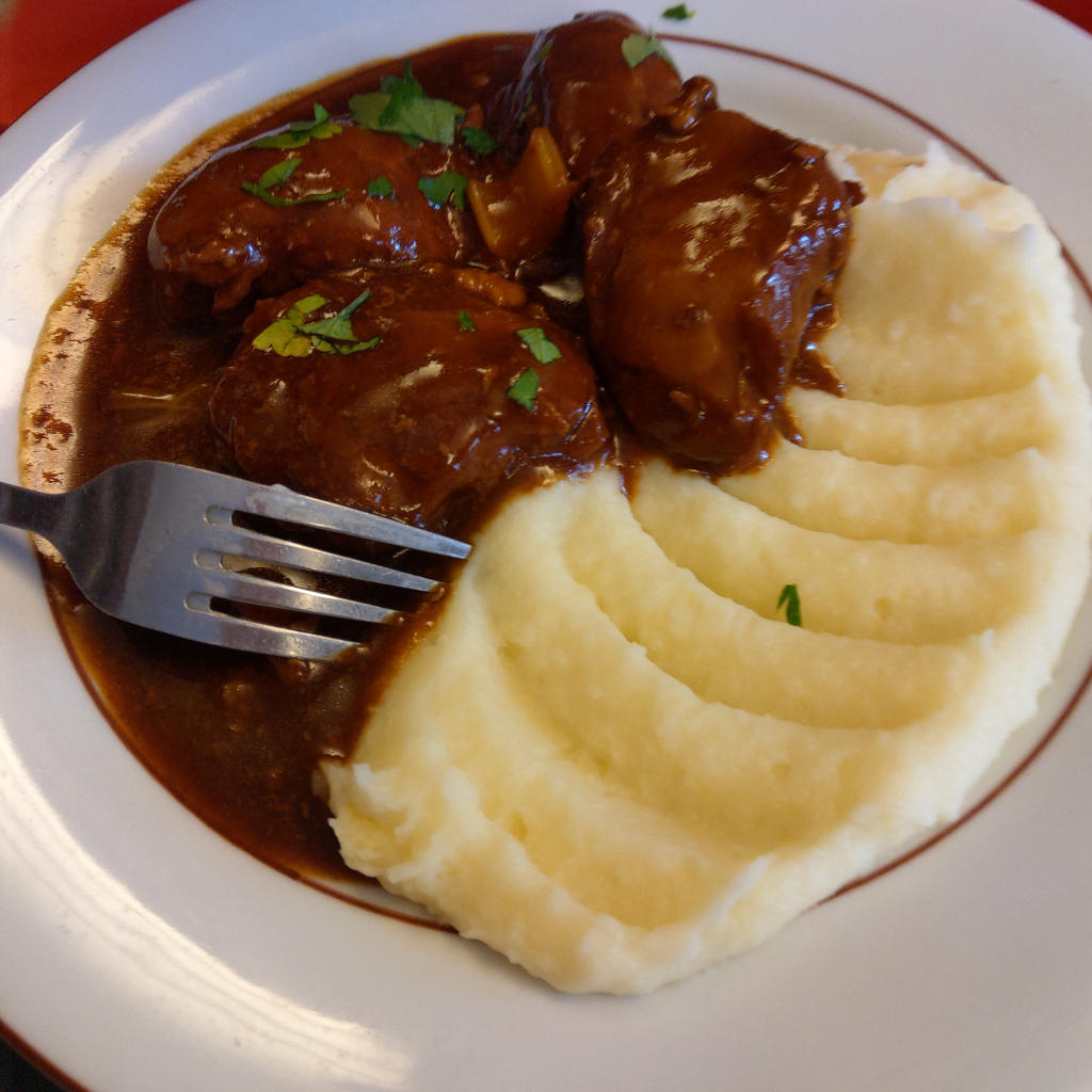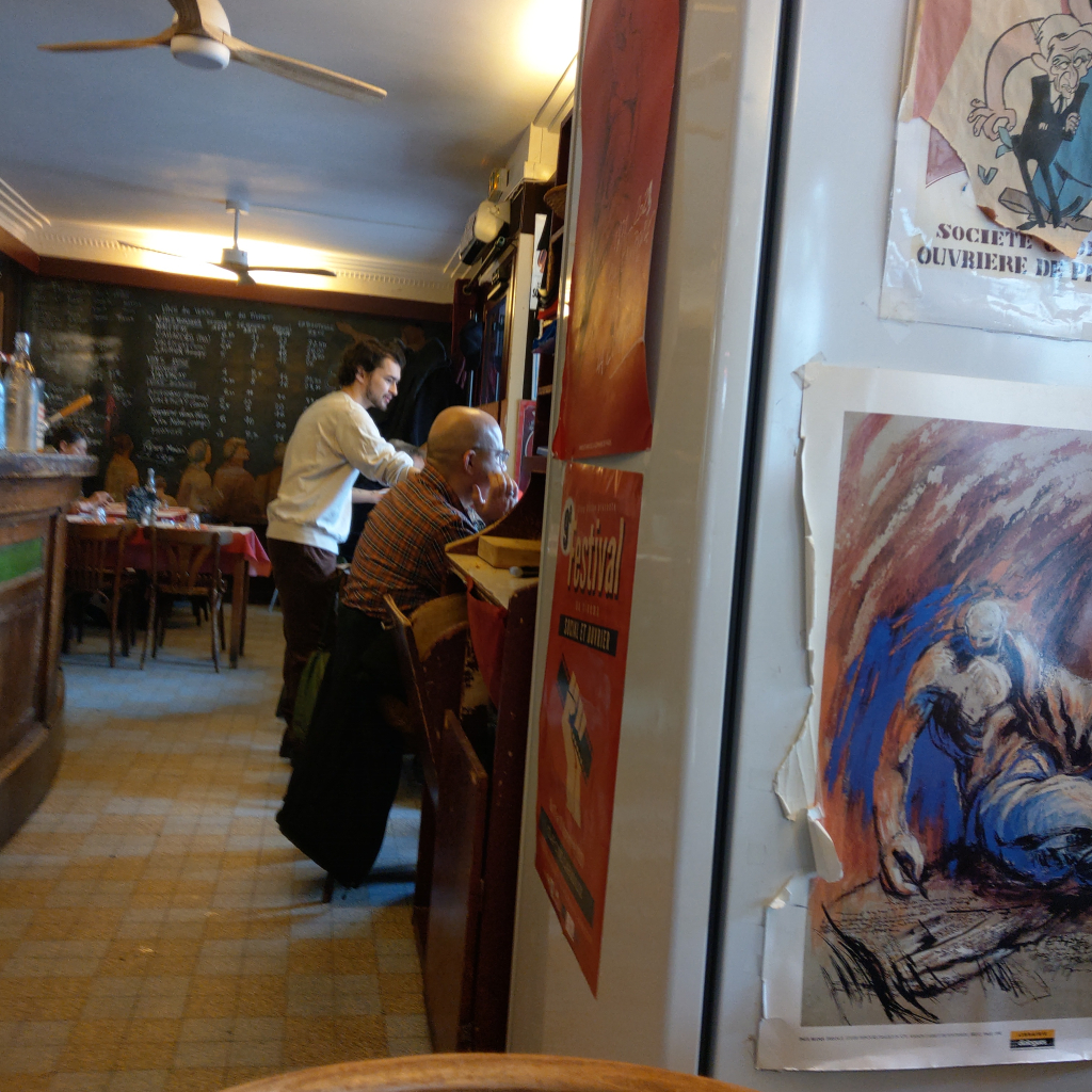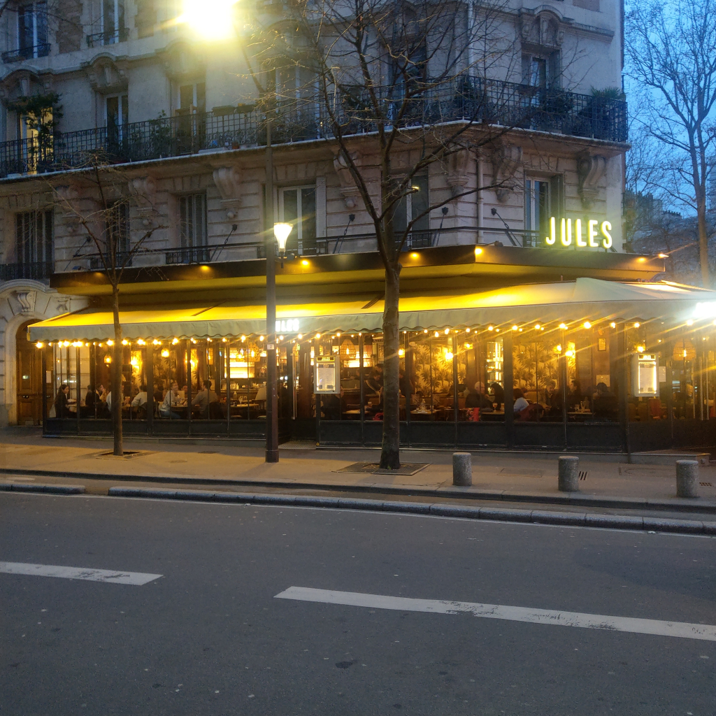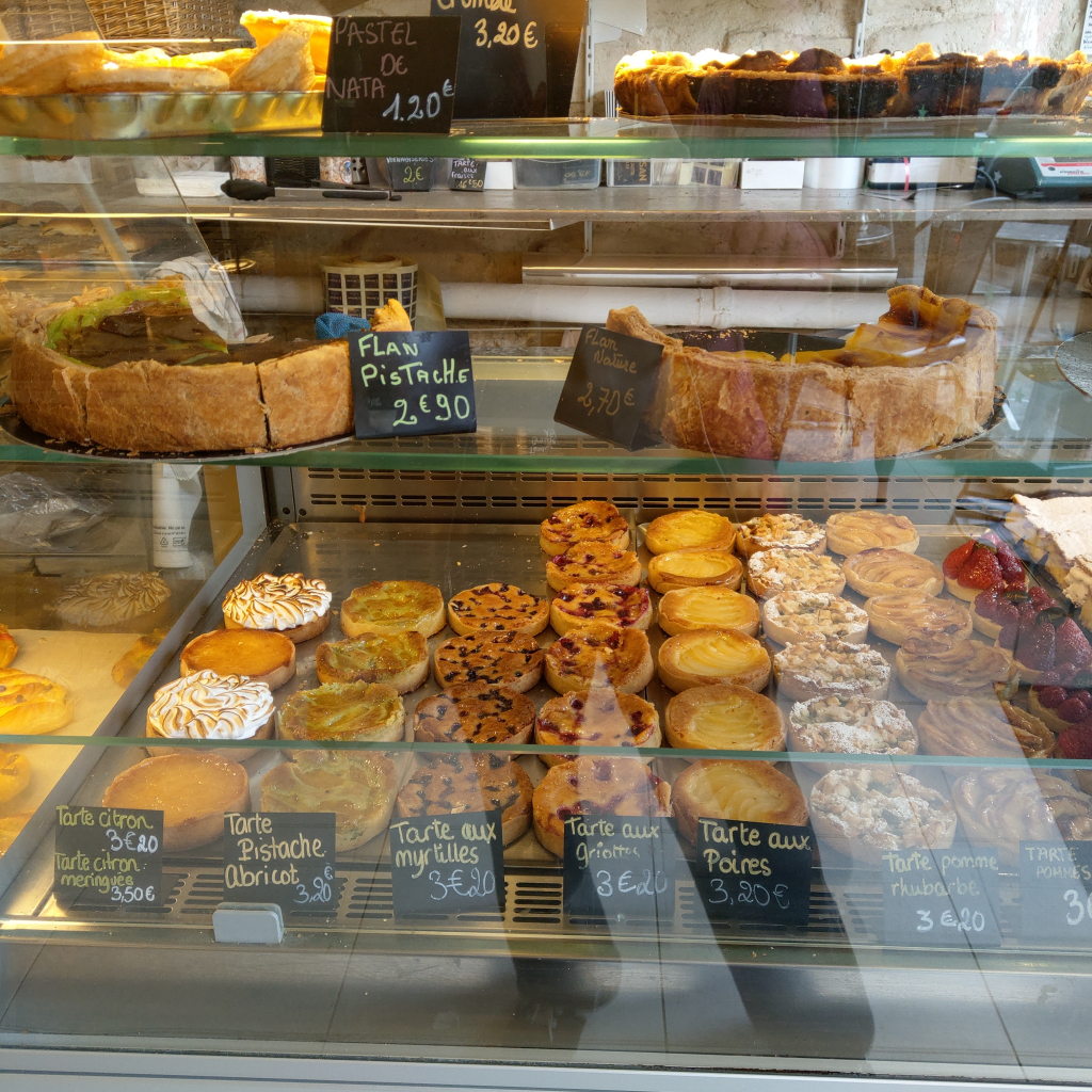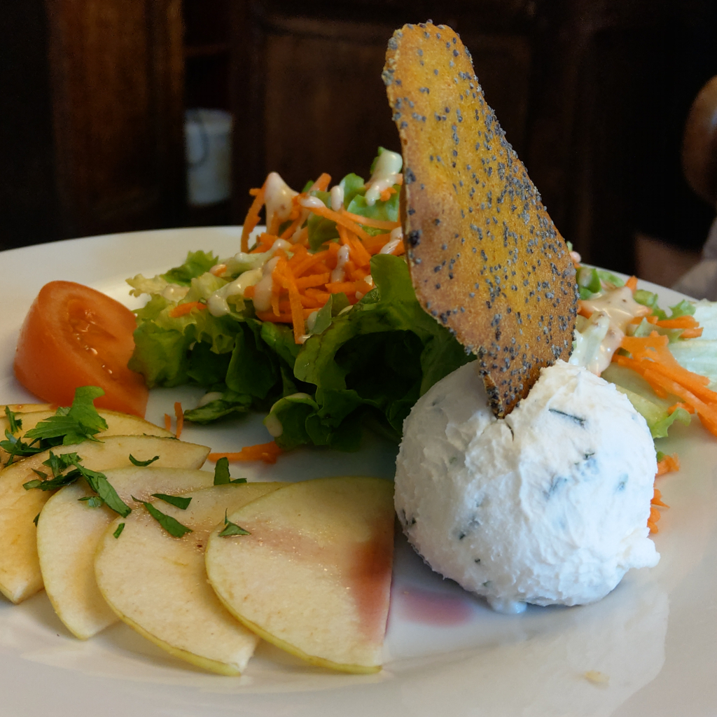 入住時間是下午3點,櫃台表示可以利用飯店休息區整理行李,暫寄於儲藏室。因為長途航班的勞累加上時差,整理行李的時候感覺自己思考的速度變得非常緩慢,行李翻來找去半天才能找到想要的東西,整頓好行李後,已經是中午12點多了,附近餐酒館林立,一時不知道要從何選起,挑了一家順眼的餐館入內,店員英文可通且有英文菜單,最便宜的主餐加甜點要21歐,選了一道Colombo de Poisson(Fish Colombo)以及巧克力聖代,友人則選擇24歐的套餐,選擇山羊起司沙拉、燉豬頰以及栗子聖代。