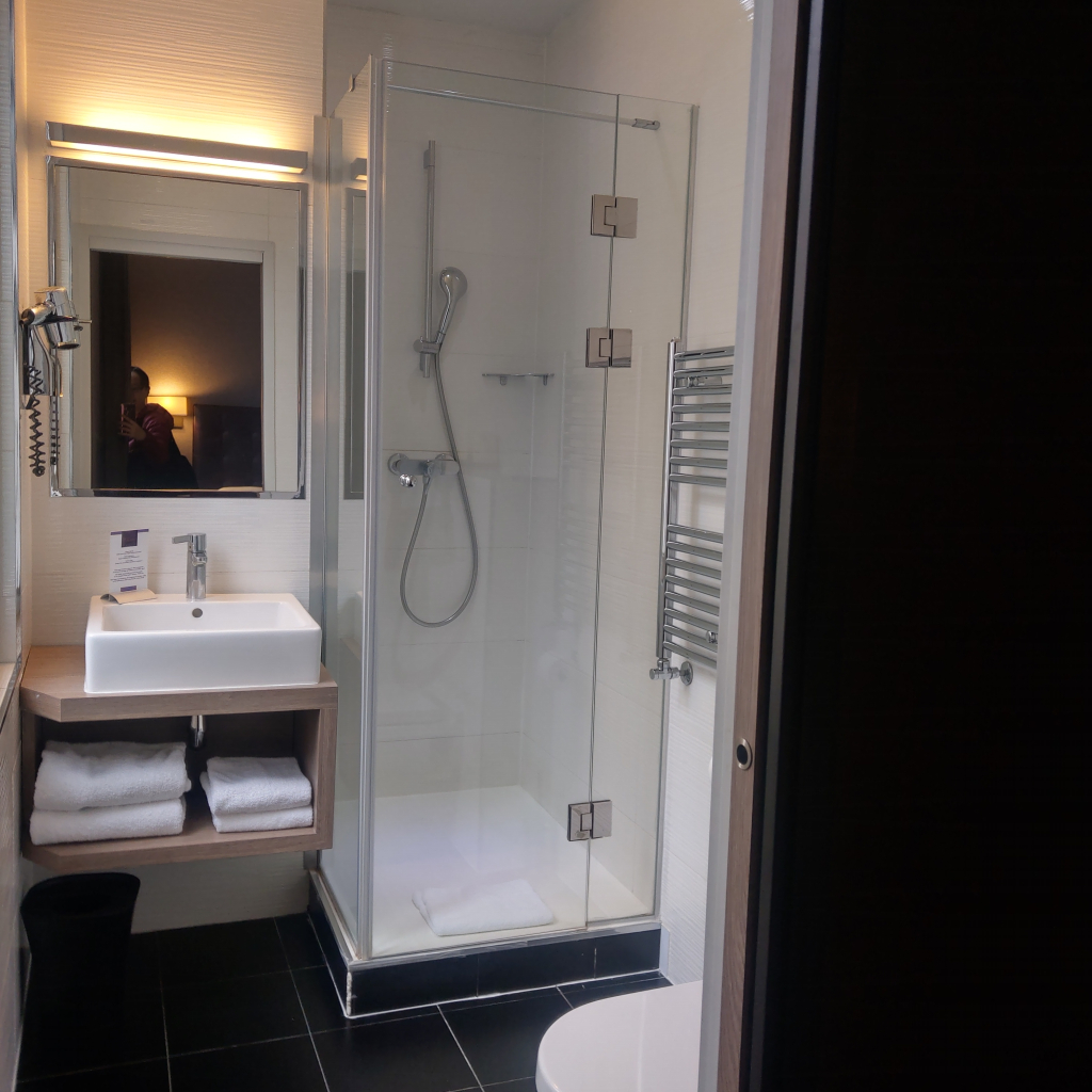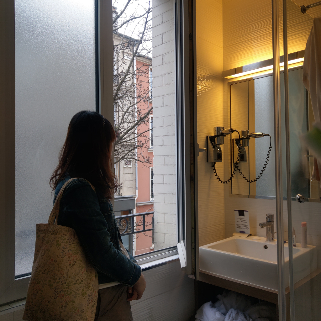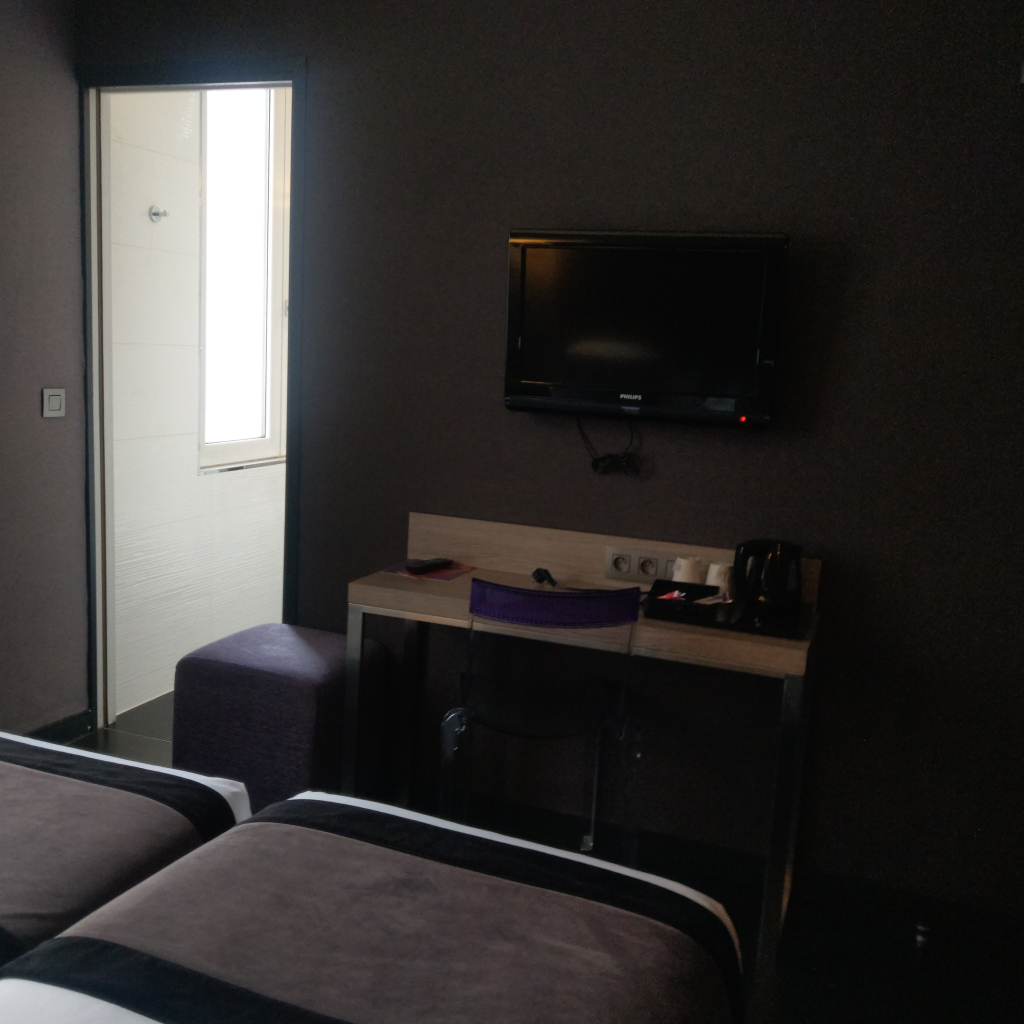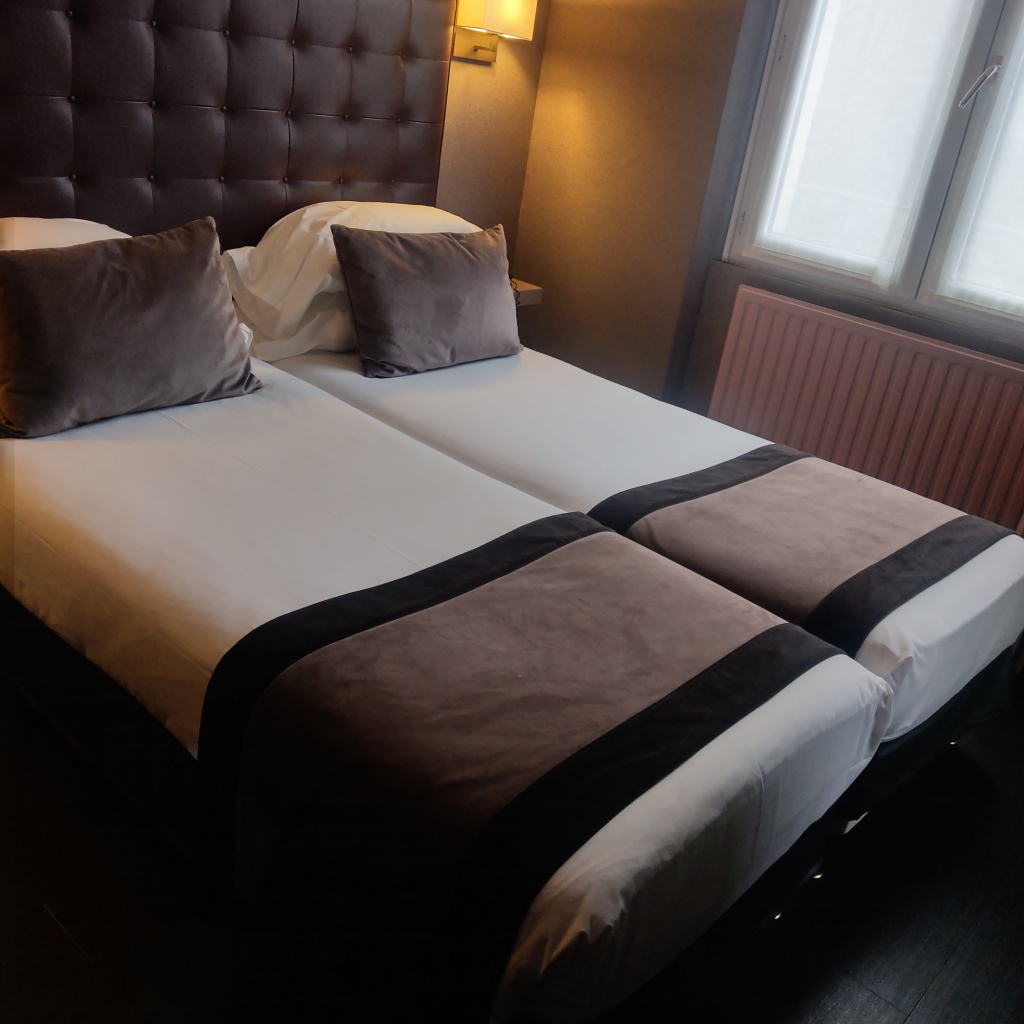 結果這間飯店2樓(歐洲1樓)的房間意外的不吵,一來是飯店本身坐落於寧靜的巷弄間,再來隔音窗戶發揮了很大的功效,附近一代的餐廳似乎都營業到午夜12點或凌晨2點,加上法國人超愛坐戶外聊天,晚上回到房間卻相當安靜,沒有像網路上說的被隔壁餐廳的客人聊天聲吵到睡不著的情形,直到我們因為剛開始不太熟悉房內冷暖氣的切換,因為房間過於溫暖而打開窗戶透氣,才發現經過的車輛以及喧囂的人聲一點都不安靜,但神奇的是,只要一關上窗,就完全感受不到噪音的存在。此外,之後每天在外馬不停蹄的奔走,回到房間簡單整理及梳洗後幾乎是倒頭熟睡,完全沒有被吵的機會。