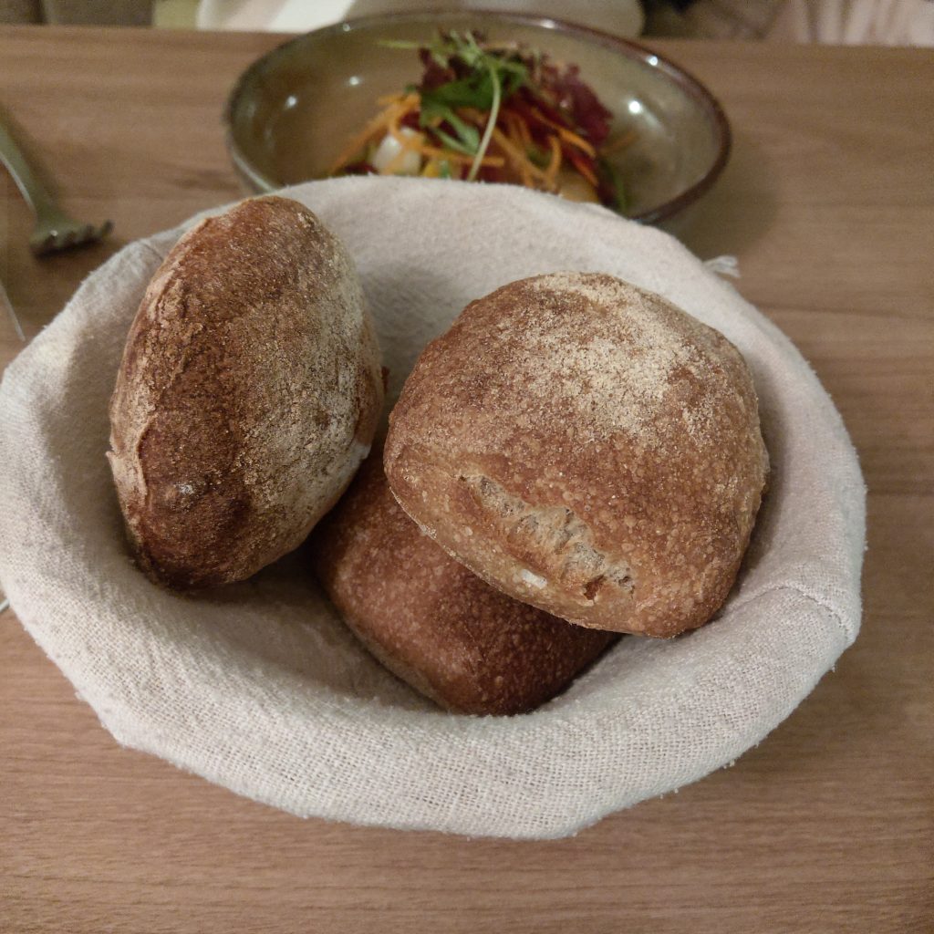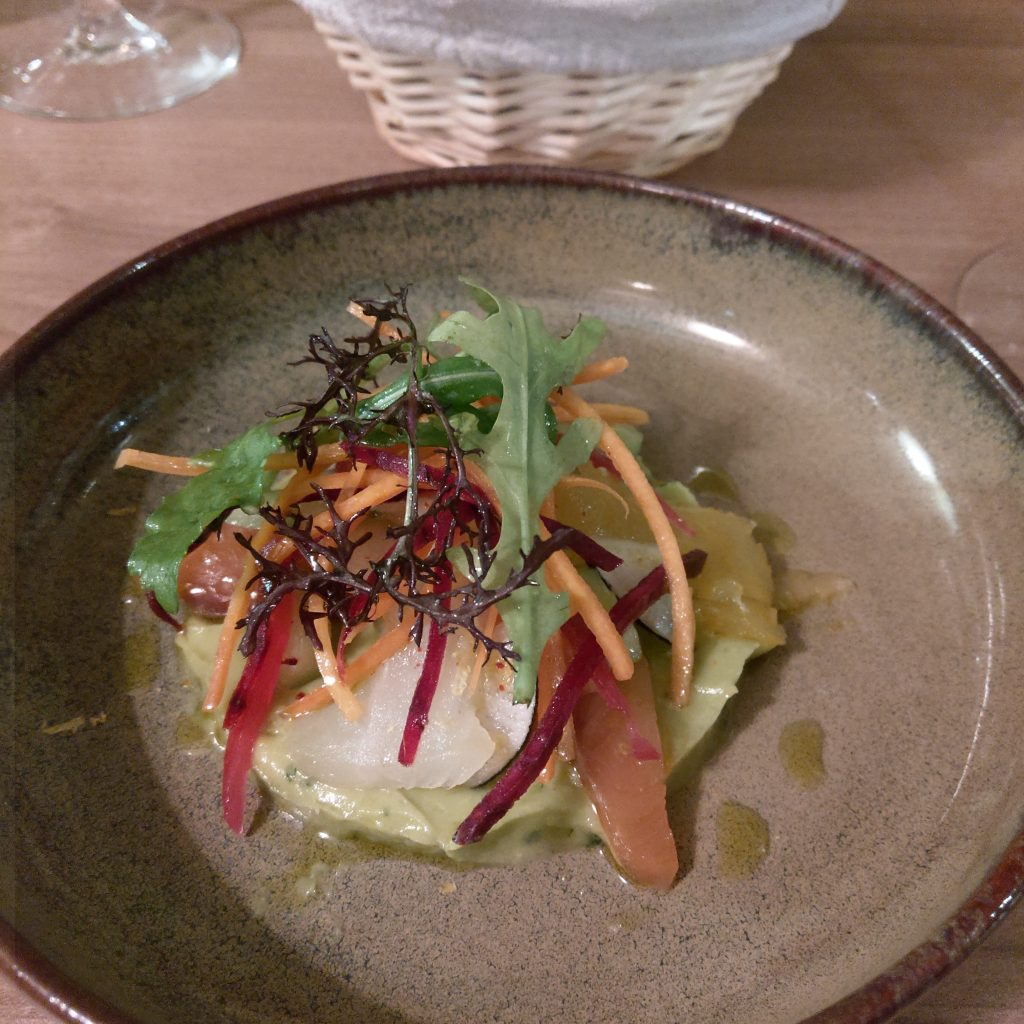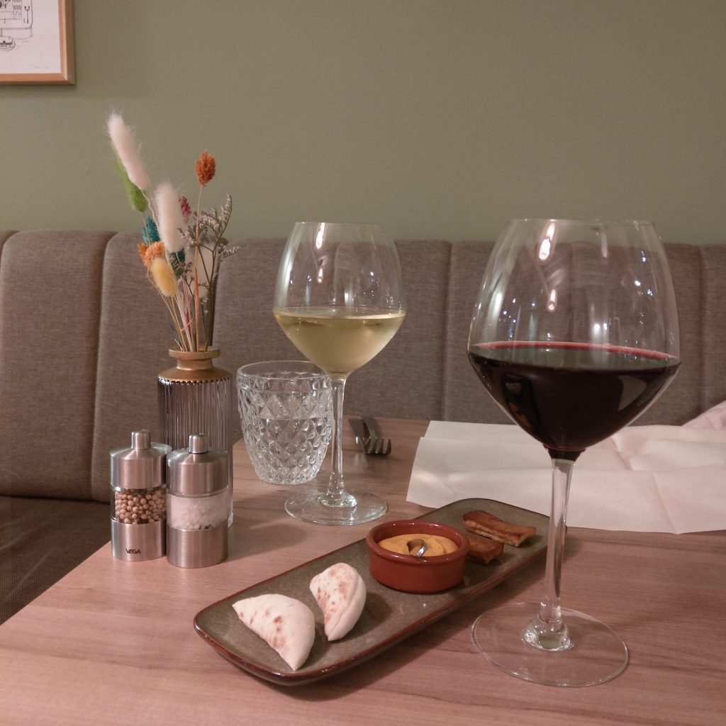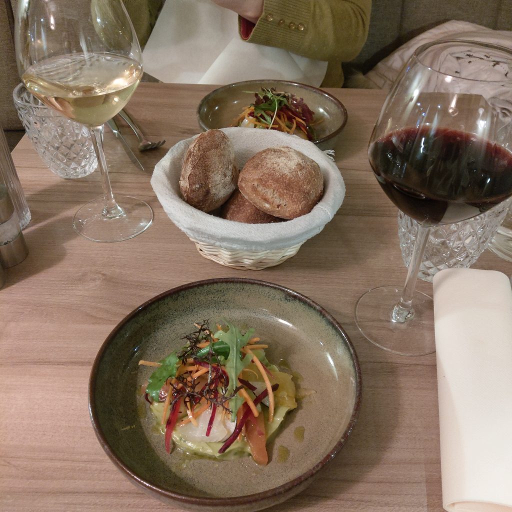 在等待途中,餐廳招待小點,麵包及酒先送來,法餐的小點總是充滿驚喜,每家的口味都不同,麵包紮實有嚼勁,正餐的部分擺盤精美,味道中規中矩,酒類的部分果真還是友人的白酒好喝,我點的紅酒不至於難喝,但不知道是不是因為是餐酒的關係,味道比較濃郁,和想像的味道不同。