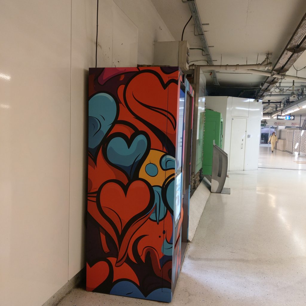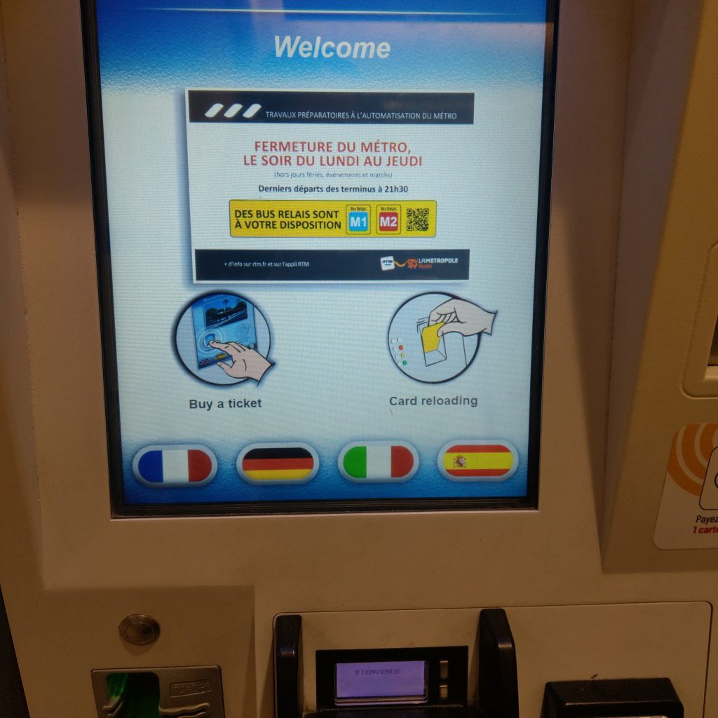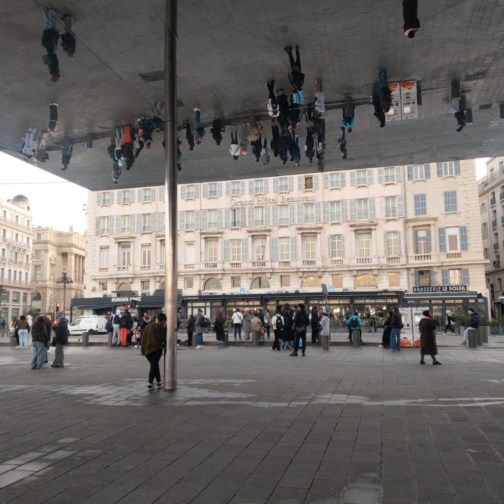 現有的兩條地鐵系統因為比較是晚蓋的,風格新穎現代,橘色的車廂充滿活力及科幻感,因為待的時間不長,利用售票機買了馬賽1日(24H)券,5.2歐公車地鐵搭到飽,甚至下午去卡西斯那兒的公車竟然也能使用。搭M1地鐵到Vieux Port站,出站就可以看到著名的裝置藝術加遮陽(雨)棚-諾曼的大傘,經過傘下的人大都會忍不住對著鏡面拍攝自己的倒影,結果卻發現拍別人的倒影更有趣…