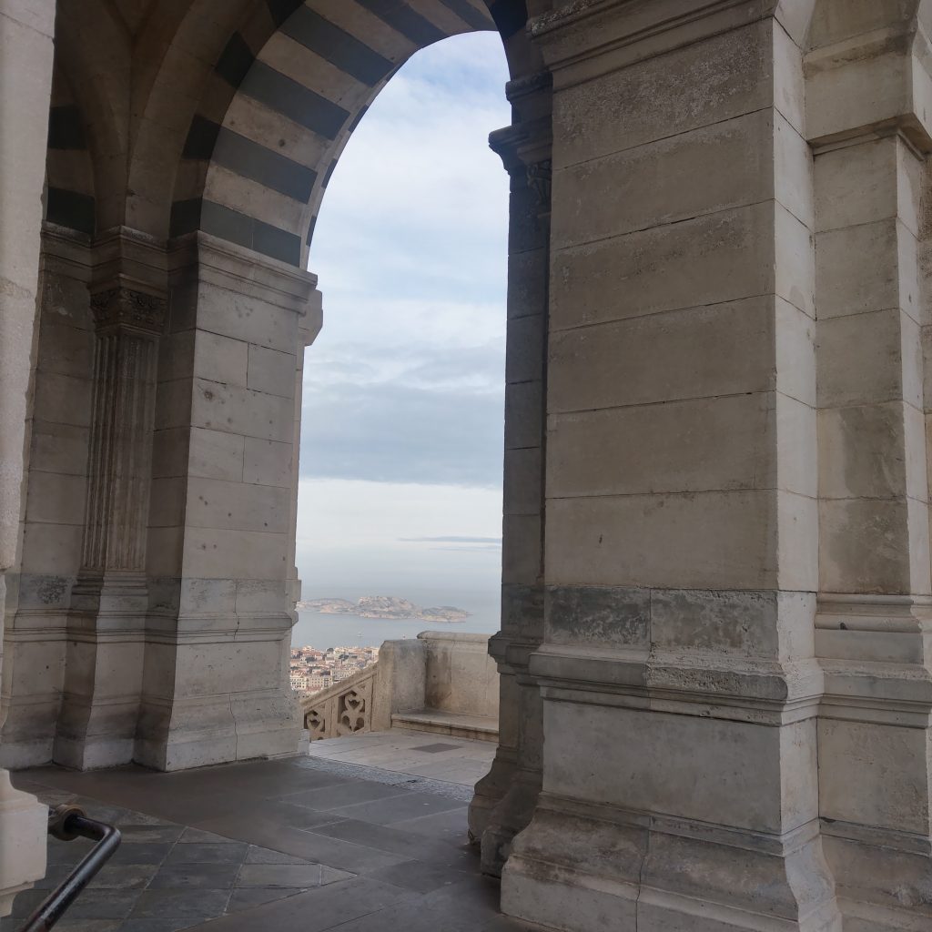 守護聖母院位在山頂,剛到的時候山間雲霧還未散去,竟然在歐洲也能見到國畫中雲裡霧裡,山巒朦朧的景象,等霧散去後,居高臨下眺望前方的地中海,不禁深吸一口氣,嗯,這就是傳說中的地中海,從這裡觀賞馬賽的風景,比網路相片及預想的還要漂亮千百倍!!!