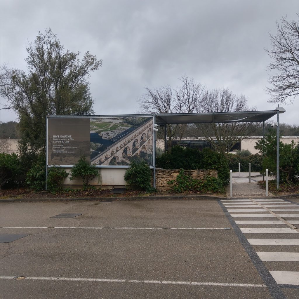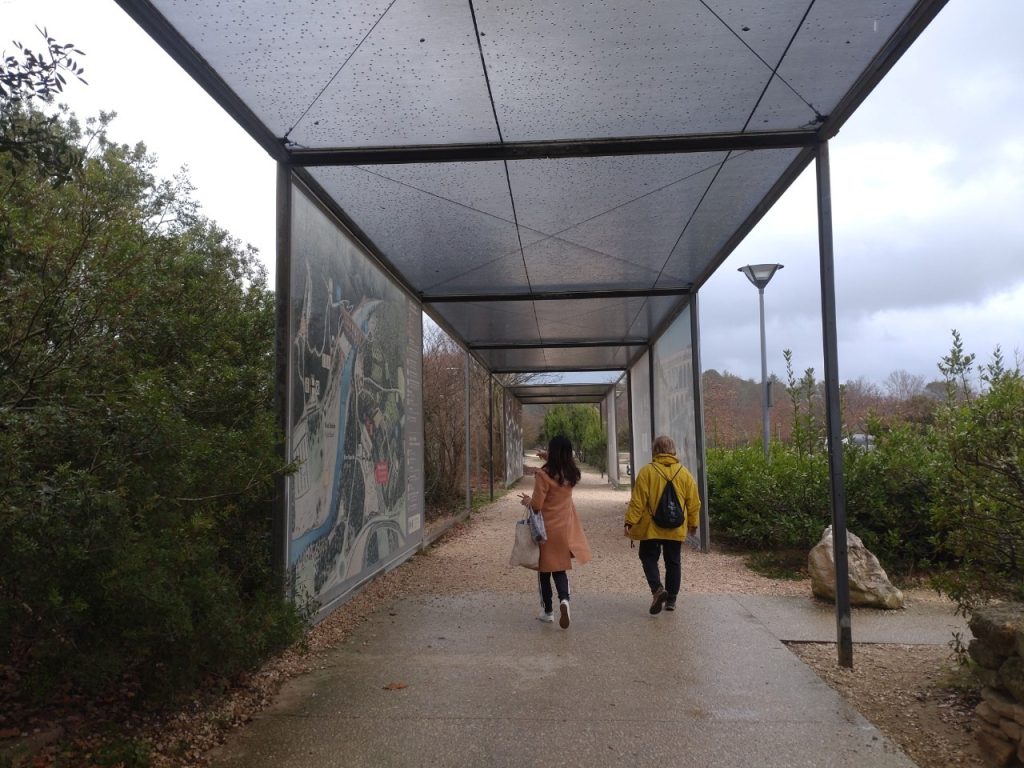 進入園區後會經過一段寬廣的現代展示中心及博物館,淡季沒什們人潮,可以悠閒的參觀,無奈回程的車預計13:20到站,沒搭上這班就要等到傍晚5點多,沒有時間逗留,只好繼續前行,又往前走了一小段路後,總算這個要跨越10,012 公里(台北到法國)以上的距離,經過2千多年的光陰(西元1世紀至今)才得以相見的景點-嘉德水道出現在眼前,橋本人果然十分壯觀。