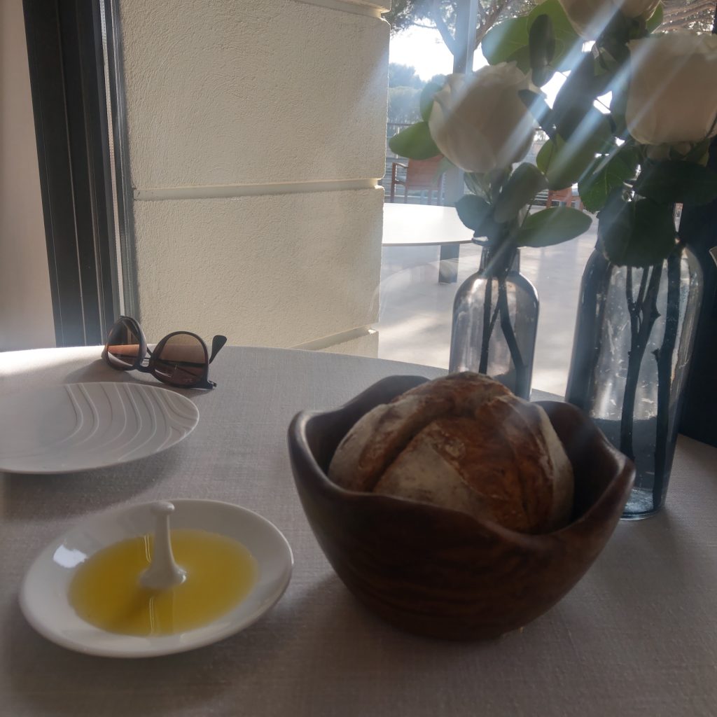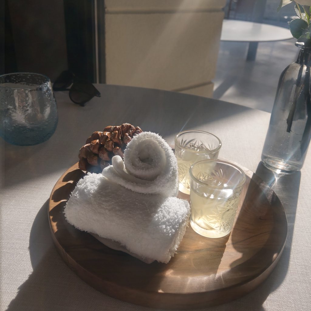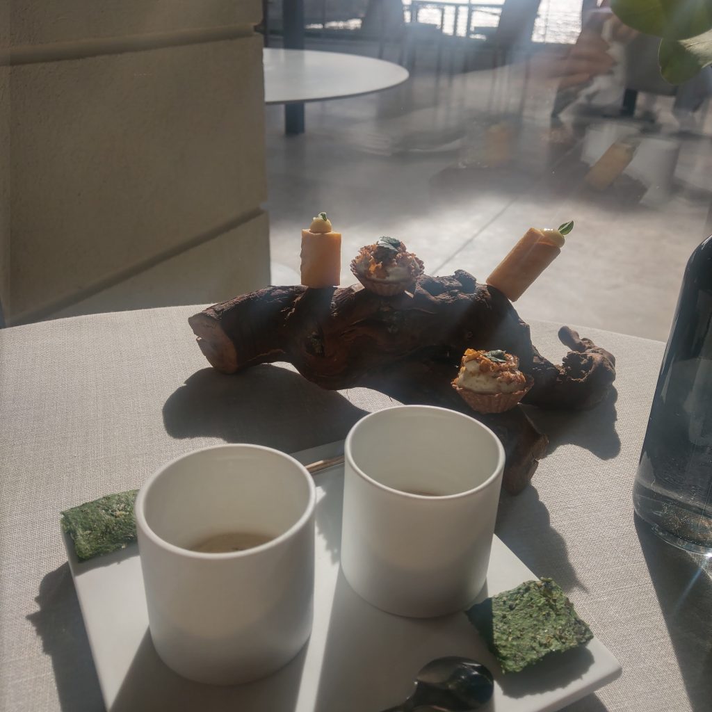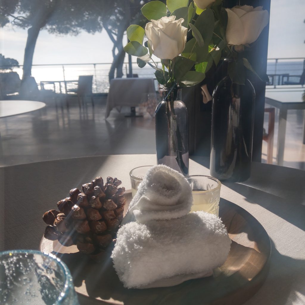 因為是最後一組入座,被安排在角落陽光直射的位置,雖然有大片落地窗可以觀看海景,多少有點擔心一頓飯吃完會被曬傷或是曬黑 (不誇張,冬天南法中午的太陽熱情如火),,還好陽光移動地速度算快,餐點還沒上幾道,總算可以正常睜眼欣賞窗外美景。