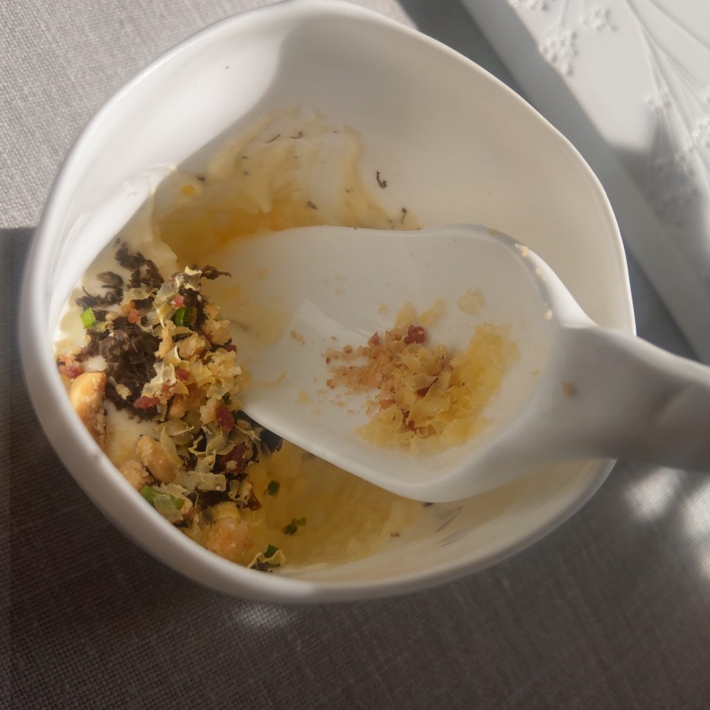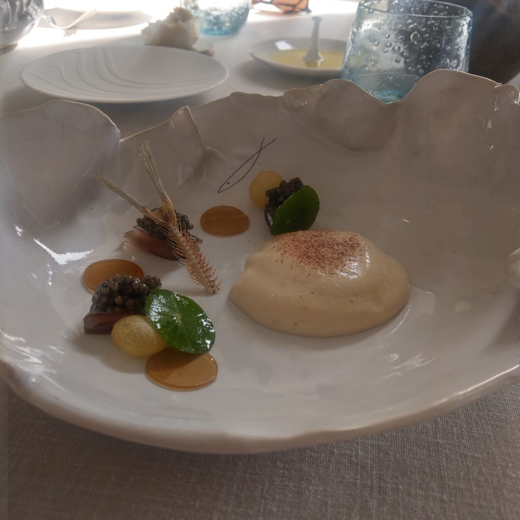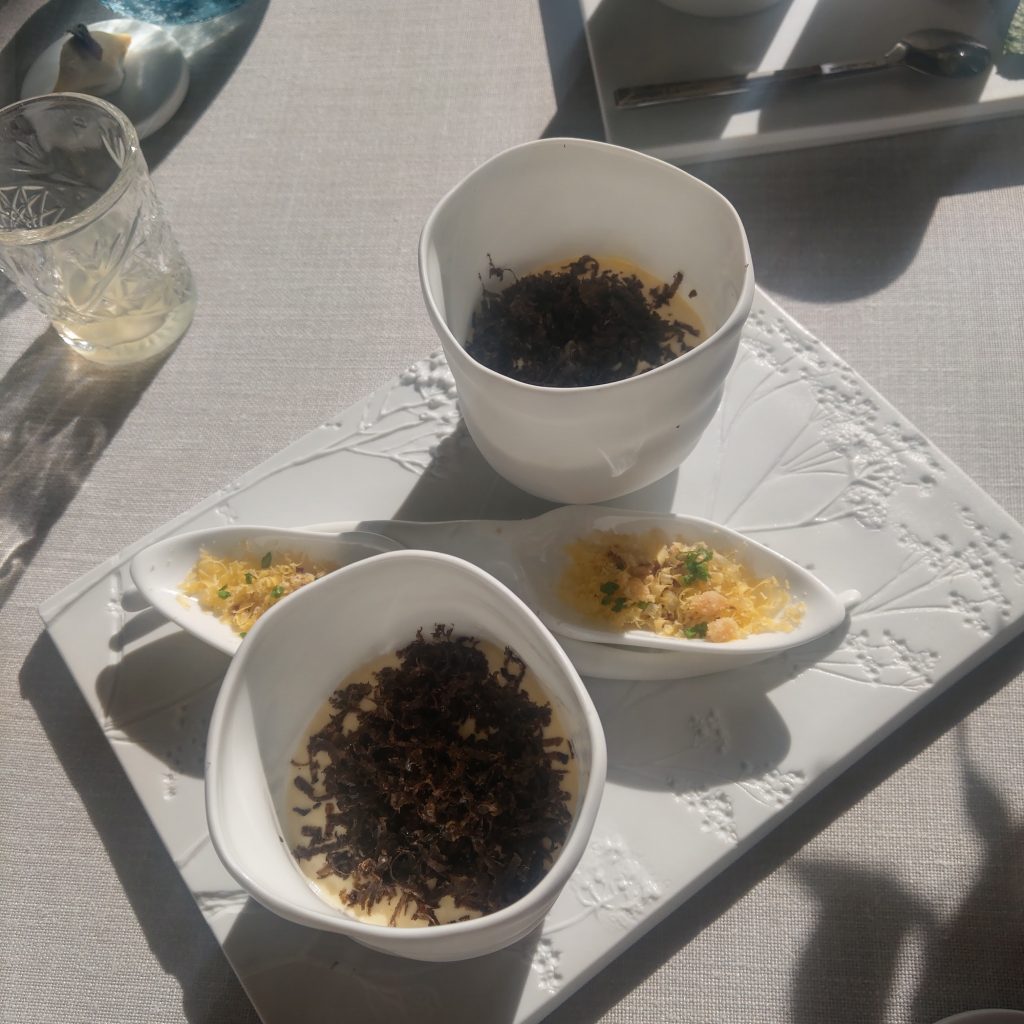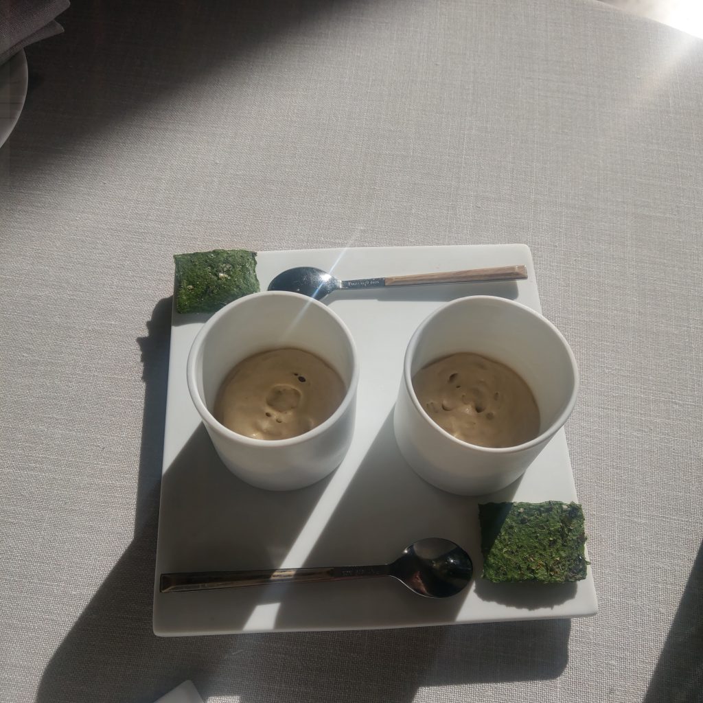 小點吃的差不多的時候,侍者送來了只有法文的菜單,進入點菜的環節。套餐部分有180歐(4道約台幣6200元)及280歐(6道約台幣9600元)的價位,本來同行的人友擔心吃不下想選擇4道,經過侍者說明,因為烹煮和服務的時間不同,同一桌只能點同樣道數的套餐,難得來一趟,最後配合我選了6道菜品的套餐。服務人員顯得有些驚訝及開心,畢竟我們剛剛連香檳都不打算喝,只要白開水,雀躍的問我們: