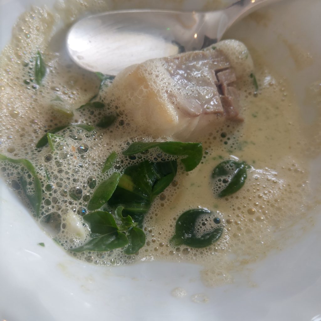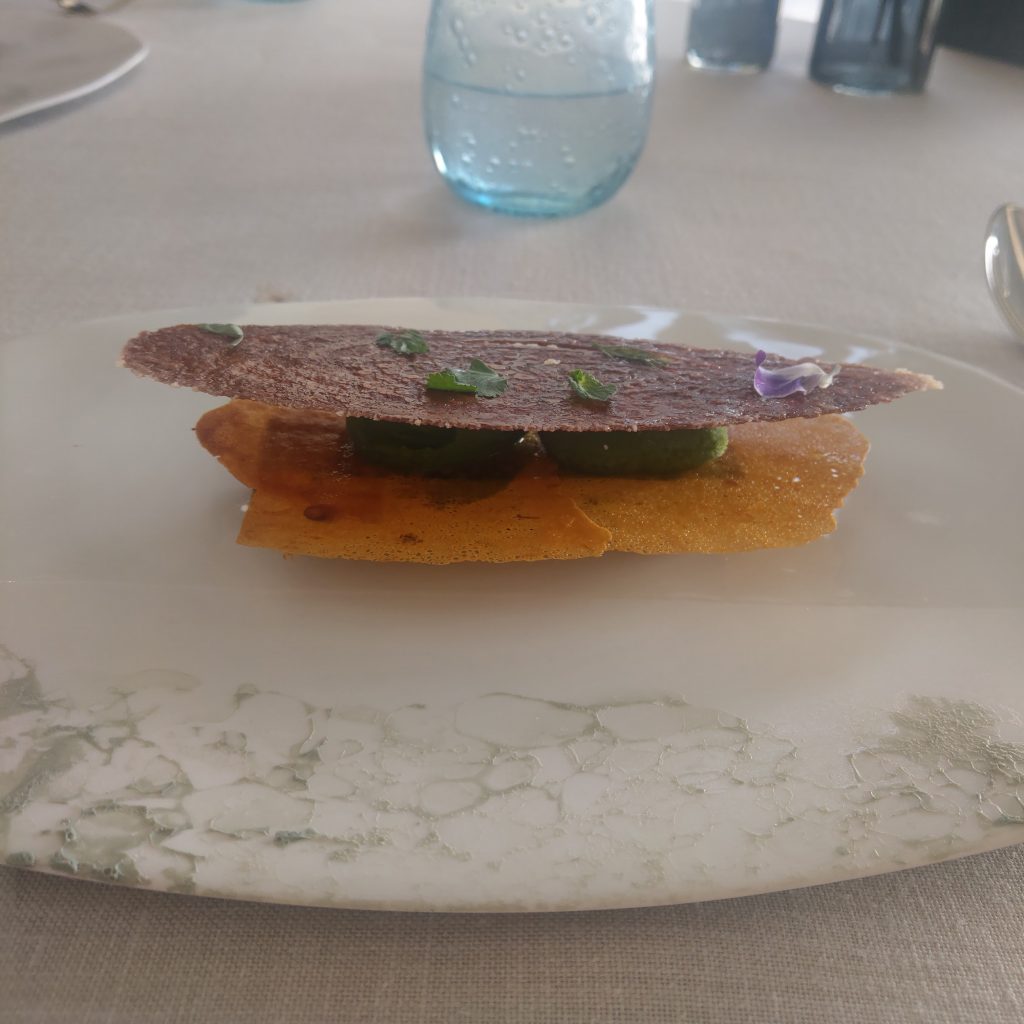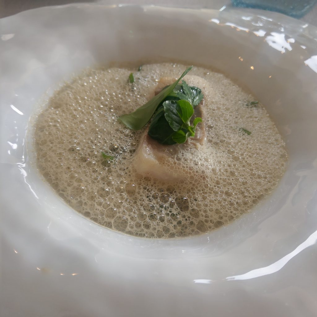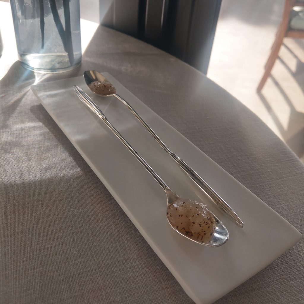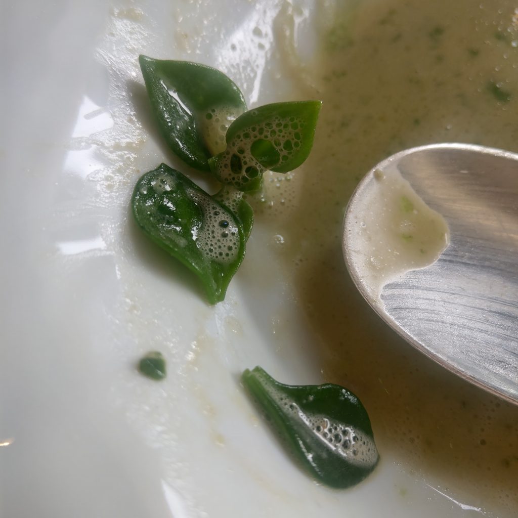 • 譬如第二道Google 翻譯“鱸來了”以及“牡蠣的泡沫”的菜,女侍者在介紹的時候說了一句“It tastes like citrons”,前兩者的味道不陌生,但沒有看見類似柑橘的配料,後來發現原來是搭配的綠色小葉子,咬下去有檸檬清爽的味道。下一道生魚片餅乾,侍者介紹一旁小碗裡的食材時說了一個感覺有聽過但想不起來的字,我問“Is that a plant? ””No, it’s a creature in the ocean with a lot of stings. “(加上手勢),經過味覺驗證,嗯,是海膽。