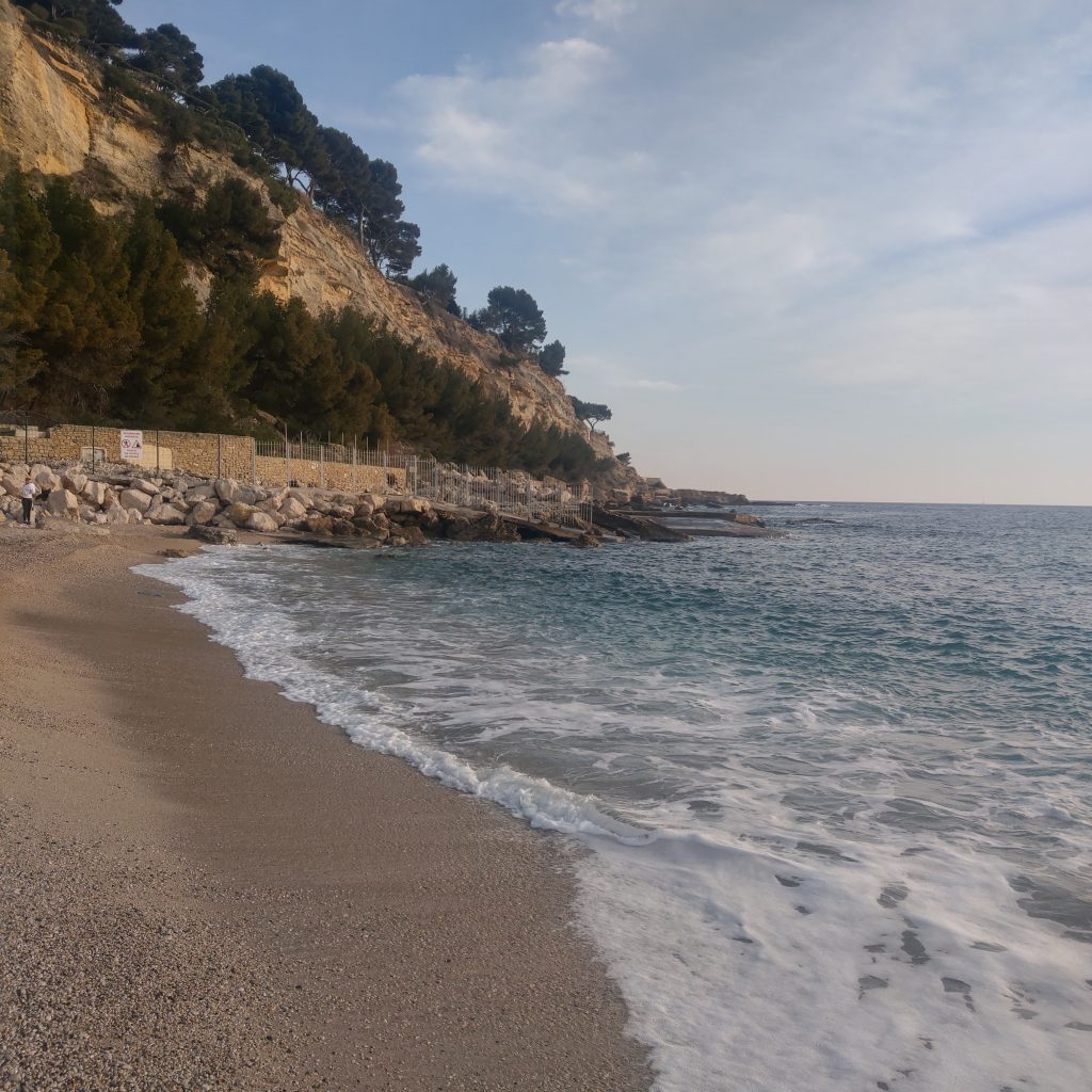 離開餐廳大約3點多,總算來到附近的海灘坐坐,這天卡西斯的氣溫大約17、8度,雖然是冬天,但在熱情太陽的加持下,是可以去赤腳踏浪的,二話不說捲起褲管,經過一小段布滿小石子的天堂路 ,終於踏在柔軟的沙地上,讓地中海的海水敲打,開心~~